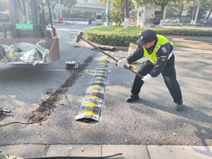 由于停車場是高鐵場站的重要組成部分,車輛在進出停車場時需要經(jīng)過減速帶,而維護不善的減速帶存在著嚴重的安全隱患。為了解決停車場減速帶老化和維護不善的問題,對高鐵場站停車場的減速帶進行定期檢查和維護是至關(guān)重要的。近日,地面停車場秩序維護員在區(qū)域巡邏時發(fā)現(xiàn)有一處減速帶嚴重損壞,中間露出兩排鋼釘,不僅失去了減速的作用,還容易將過往車輛的車胎扎破。他立即將這一問題上報領(lǐng)導,項目經(jīng)理劉源迅速對現(xiàn)場情況進行查看,并與相關(guān)部門對接聯(lián)系,隨后秩序維護員劉本良協(xié)助維修班工作員對地面停車場靠4號崗亭交叉路口的破損減速帶進行了更換,給過往的車輛和行人提供了便利,確保通行安全。