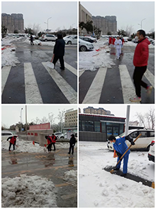 今天上午雪粒子還在不斷往下落,醫(yī)院領(lǐng)導(dǎo)各部門和我們物業(yè)抽調(diào)了四名保潔和六個(gè)保安共同清理積雪。首先,項(xiàng)目經(jīng)理在每個(gè)重要的通道有序安排人員,他們各負(fù)其責(zé),有鏟雪的、推雪的、掃雪的、堆雪的、還有專門負(fù)責(zé)撒鹽的。很快在醫(yī)院八點(diǎn)半就診之前,大家在各個(gè)重要的出口和交通要道,鏟出了一條安全通道。只見他們的頭上都冒出了熱騰騰地蒸氣,大家齊心協(xié)力驅(qū)散了寒氣,也為醫(yī)患開辟出了一條安全之路。