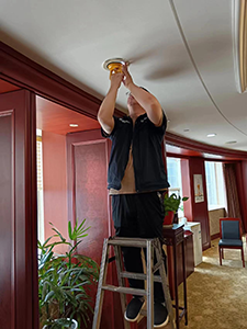 為了迎接客人的到來(lái),項(xiàng)目管理人員及時(shí)對(duì)客梯進(jìn)行梯控,節(jié)約了集團(tuán)客人等待時(shí)間。會(huì)議室提前開(kāi)燈,空調(diào)調(diào)至舒適的溫度,準(zhǔn)備茶水,配合集團(tuán)人員擺放席卡。突然我們發(fā)現(xiàn)會(huì)議室有一個(gè)燈毫無(wú)規(guī)律的閃爍,距離會(huì)議開(kāi)始僅剩半小時(shí),為了給客人一個(gè)舒適的開(kāi)會(huì)環(huán)境,我們趕緊和工程部戴師傅取得了聯(lián)系,師傅拿上工具及時(shí)趕到,架起梯子開(kāi)始檢修。經(jīng)過(guò)排查是線路有些接觸不良,師傅抓緊時(shí)間把線路整理安裝并固定到位,會(huì)議室又恢復(fù)了之前的明光爍亮。