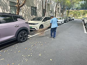 在這炎炎夏日,朱師傅一大早推著他的工具車(chē),拿著大掃帚、簸箕在路上打掃起來(lái)。他仔仔細(xì)細(xì)地清掃著每一個(gè)角落,每一片落葉,掃帚與地面接觸發(fā)出“沙沙”的聲音,像一首優(yōu)美的旋律。就這一個(gè)簡(jiǎn)單枯燥的動(dòng)作,他每天早上要重復(fù)兩個(gè)多小時(shí),然后再拿簸箕一堆堆裝袋。掃把在朱師傅手里,仿佛一根魔法棒,魔法棒一揮,院區(qū)每條道路都變得干凈如洗。看著整潔的道路他露出了滿(mǎn)意的微笑。