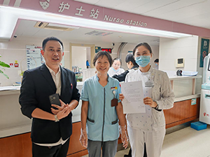 在日常工作中,錢(qián)阿姨時(shí)刻保持高度的責(zé)任心和敬業(yè)精神,在做好日常服務(wù)工作的同時(shí),積極了解患者和家屬需求,耐心、細(xì)致的解答患者提出的問(wèn)題。遇到需要幫助的患者,她也會(huì)伸出援助之手,屢次得到科室醫(yī)護(hù)人員和患者的表?yè)P(yáng)。這份愛(ài)崗敬業(yè)深深打動(dòng)了護(hù)士長(zhǎng),307護(hù)士長(zhǎng)代表科室全體醫(yī)護(hù)人員對(duì)錢(qián)阿姨表示了感謝,對(duì)項(xiàng)目服務(wù)團(tuán)隊(duì)的工作表示了認(rèn)可。