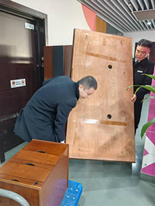 當(dāng)天,1號樓常州新聞中心幾位員工因需要搬運(yùn)大型家具,正為搬運(yùn)難題發(fā)愁。物業(yè)安保人員朱志國在巡邏過程中了解到這一情況后,立即向物業(yè)匯報(bào),并主動提出幫忙。隨后,在物業(yè)工作人員的組織下,多名安保人員和物業(yè)工作人員一同前往員工辦公室中。