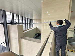 考慮到二樓連廊和橫梁距離較遠(yuǎn),普通的清潔工具和方式難以施展,我們采用了高層掃這種相對比較適合的工具。然而,由于距離較遠(yuǎn),這就給師傅們的清理工作帶來了很大的難度。在清理過程中,師傅們難以像在近距離清理時那樣輕松發(fā)力,每一次揮動高層掃都需要付出更多的力氣和精力,而且還要精準(zhǔn)地控制方向和力度,以確保能夠有效地清理到橫梁上的污水和碎玻璃。