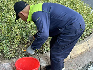 保潔團(tuán)隊(duì)迅速集結(jié),她們滿懷熱情,佩戴著手套,提著水桶,化身“綠色守護(hù)者”,穿梭于每一片綠化區(qū)域之間。他們細(xì)心搜尋,不放過任何一個(gè)角落,將那些隱藏在草叢中的石頭一一挑出,放在水桶里,在整個(gè)清理過程中,保潔人員始終秉持著保護(hù)綠化植被的原則,確保清理工作不對植物造成任何傷害。