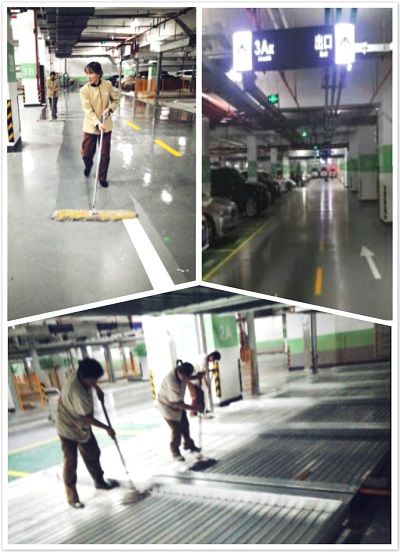 改造施工結(jié)束后,原本地上施工后到處是油漆、灰塵、污漬等。2、3號樓的保潔們先用鏟子鏟去頑固的附著物,然后用水槍仔細沖洗,接著用大推布一遍一遍的推擦,眼看著車庫地面慢慢露出了本來的顏色,變得越來越亮,最后再用拖把和抹布把角角落落都擦的干干凈凈。