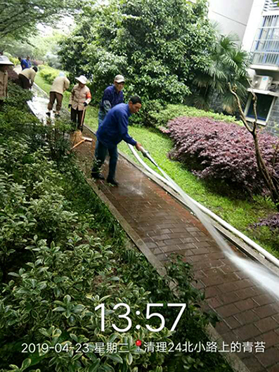 4月23日下午我們物管人員組織全體的保潔員開始了清理青苔的工作。為了能更快地完成清理工作,保潔隊(duì)長(zhǎng)和維修人員一起配合,從31棟的消防取水點(diǎn)接水管先對(duì)有青苔的小道進(jìn)行沖洗,然后讓保潔員開始清理,有的保潔拿刷子刷,有的保潔用竹掃把掃,還有的保潔用鏟刀鏟,大家各司其職,有條不紊地展開清理青苔的工作。在大家的齊心合力的作用下,工作開展的非常順利,大概用了一個(gè)小時(shí)多就完成了清理青苔的工作。