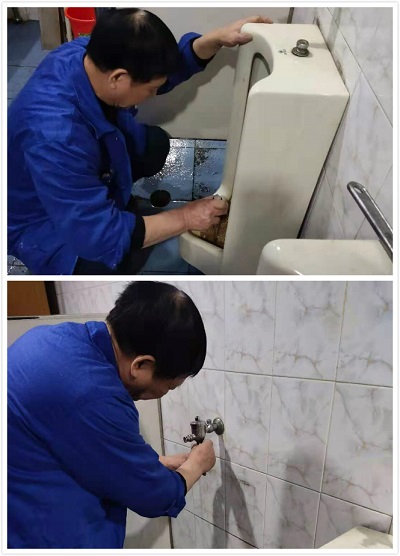 近日17樓的保潔跟往常一樣打掃樓層衛(wèi)生,發(fā)現(xiàn)樓層男廁天花板漏水,立即向工程部報(bào)修。工程部戴師傅一接到電話,趕到現(xiàn)場(chǎng)后觀察漏水情況,確定是由于18樓男廁下水管道老化破損導(dǎo)致的。因?yàn)樵鹊墓艿朗氰T鐵的,考慮到更換整根水管工程量較大,且耗時(shí)較長(zhǎng),于是與工程部的其他師傅一起,集思廣益,通過(guò)論證,決定先用PPR管將鑄鐵管包裹住,然后再用堵漏王將所有縫隙都堵住。這樣既解決了下水管漏水的問(wèn)題,也極大地縮短了維修的時(shí)間。在確保18樓下水道漏水情況徹底解決之后,師傅們對(duì)17樓的下水也逐一進(jìn)行檢查,發(fā)現(xiàn)小便池有點(diǎn)堵了,下水不夠迅速。于是又將小便池拆卸下來(lái),疏通下水管道。