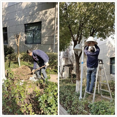 低溫中心院內(nèi)改造,院區(qū)綠化都將進行一次翻天覆地的改造。由于是二次改造,施工人員對地下管道鋪設(shè)不太了解,所以第一天施工路燈線就被挖斷。高正集團物業(yè)服務部為保障院區(qū)設(shè)施設(shè)備正常使用,立即抓緊搶修,同時也將院內(nèi)的一系列老化損壞的路燈進行排查維修。