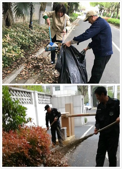 水務(wù)大廈坐落在武進(jìn)延政大道上,外圍四周布滿了香樟樹(shù),香樟樹(shù)枝盛葉茂,一到落葉季節(jié)就會(huì)有大批量的落葉紛紛落下,厚厚的像一層金黃色的被子。為了大樓的整體環(huán)境清潔美觀,為了不打擾甲方人員并給他們一個(gè)舒適的環(huán)境,物業(yè)每天早上在甲方上班之前把停車位一個(gè)一個(gè)清掃過(guò)去。笤帚一遍一遍的揮舞著,保潔員將地上的落葉掃成堆裝入垃圾袋運(yùn)往垃圾站,一袋又一袋,一圈外圍掃下來(lái)已是滿身大汗。大掃帚小掃帚不知道掃壞了多少把,垃圾車不知道推壞了多少輛。
