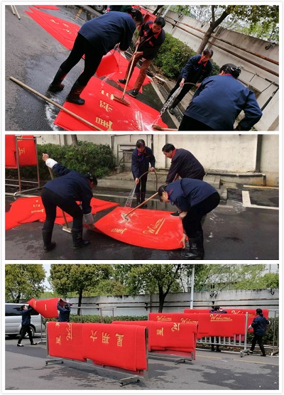 大家分工合作,迅速的投入到清洗地毯行列中去。從樓上用推車把地毯推下來,拿到后廣場上,一塊塊鋪好。大家分工明確共同協(xié)助,沖水、刷洗、晾曬,工作有條不紊。時間一分一秒過去,大家清洗地毯工作也逐漸收尾,通過大家合作努力,每一塊地毯都洗的干干凈凈。甲方領(lǐng)導(dǎo)看過后對效果特別滿意,笑著說用了幾年的電梯地毯被你們洗的像新買的一樣。