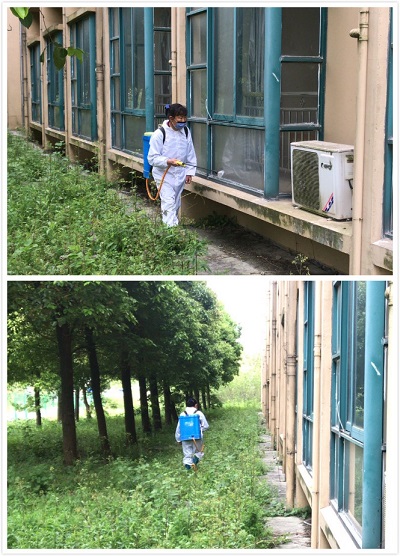 消殺安排在了下午不考的情況下進(jìn)行,物業(yè)主管先對(duì)自身消殺人員進(jìn)行安全教育工作,要求穿好防護(hù)服,帶好墨鏡口罩等防護(hù)設(shè)備,防止藥物噴濺與眼部及呼吸道,影響生命安全。