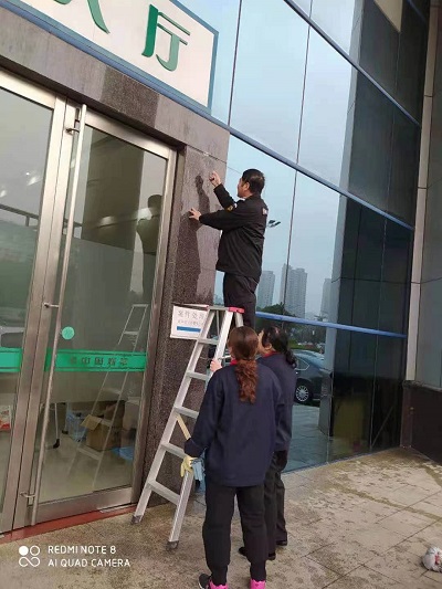 近日,武進(jìn)煙草項(xiàng)目辦公大廳門口的墻面上有貼廣告紙的膠粘在墻面很大一塊,保潔們巡查時(shí)看到了就去清理上面的膠紙,可是膠紙粘的位置很高根本夠不到,她們就去找了個(gè)扶梯,但是又不敢爬。這時(shí)候保安隊(duì)長看到立即上前幫忙,一名保潔員扶著梯子,另外一名保潔員拿來除膠劑和抹布進(jìn)行清理,沒一會(huì)功夫,膠紙被清理的干干凈凈!