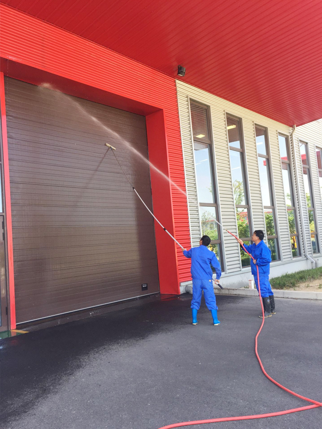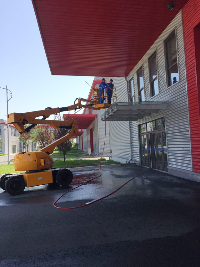 5月3日專項、保潔人員早早的到崗。一人負(fù)責(zé)開關(guān)消火栓接放水管、一個負(fù)責(zé)沖洗高處墻面、一個跟著刮洗玻璃、一人負(fù)責(zé)收沖到車間內(nèi)的水,沖洗外墻工作有序開展。當(dāng)下午13:00沖洗到5號車間前臺時,甲方值班領(lǐng)導(dǎo)開來了展臂登高車,協(xié)助我們刷洗5號前臺玻璃屋檐。