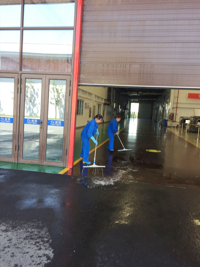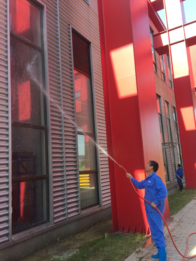 五一勞動節(jié)同方威視放假4天,作為服務(wù)行業(yè)的我們也要利用廠區(qū)放假的時間把平時比較較難清洗的地方清洗干凈。同方威視外墻是鐵皮凹凸墻面,比較容易有灰塵。平時物流區(qū)域叉車、鏟車、大貨車進(jìn)出頻繁,清洗工作難開展。展廳周圍經(jīng)常有領(lǐng)導(dǎo)和外賓參觀,不方便作業(yè)。4月30日項目負(fù)責(zé)人制定好沖洗計劃:使用哪處消防水管、需要多少時間、沖洗多少區(qū)域、加班人員名單、登高作業(yè)區(qū)域的安全性等一一做好詳細(xì)計劃,遞交甲方負(fù)責(zé)人審批。經(jīng)過審批同意后方可進(jìn)行安全沖洗工作。
