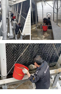 5月8日管理部帶領(lǐng)維修師傅、保安、保潔來到7樓平臺清洗冷卻塔。我們每年在冷凍機組開啟之前都會對冷卻塔進行一次徹底的清洗,塔里面長滿了青苔,污垢,如果不清理掉就會對設(shè)備造成傷害。