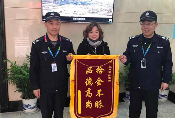 過了20分鐘左右,一名女士行色匆匆的來南門尋找東西,保安發(fā)現(xiàn)以后,問她是不是少了東西,她說是的,丟了一個包,后來經(jīng)過對包里的東西和本人身份證的核對,準(zhǔn)確無誤,將包還給了失主,失主萬分感謝,并送了一面錦旗,以表示感謝!