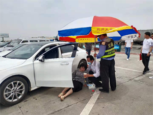 2021年5月25日的東臺服務(wù)區(qū)廣場川流不息,大家都在井然有序的工作中.我公司保安周禮峰于11:37分在西區(qū)保安崗?fù)で皬V場執(zhí)勤時,發(fā)現(xiàn)一位旅客突然倒在車位上,面色難看。立即跑步前去詢問。倒地顧客還沒有昏迷,保安見狀即刻打電話匯報,服務(wù)區(qū)管理人員知曉后第一時間趕到事發(fā)現(xiàn)場,立即啟動應(yīng)急預(yù)案,用對講機召集其他保安前來幫忙,管理人員邊安排保安拿來遮陽傘,邊匯報給甲方值班人員。