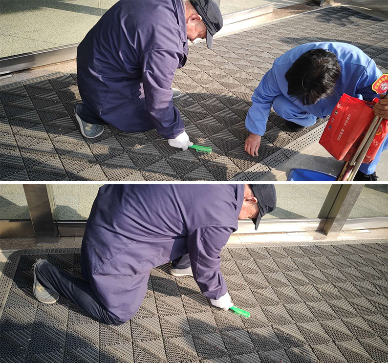 “好醫(yī)管”醫(yī)療事業(yè)部啟東市人民醫(yī)院項目部,5月18日下午,趁著休息天人少,機動師傅計劃把內(nèi)科西門的防滑墊子清潔一下。他拿上保潔工具,叫上大廳里的保潔阿姨,兩個人開始對防滑墊子進行徹底的打掃。他們先把防滑墊子移到臺階上,然后用手拍打墊子,使卡在墊子里的灰塵和臟東西全部掉下來,接著阿姨把地上的臟東西先清理干凈,然后兩個人把防滑墊子拖回原地,由于有些絨毛當時不能被拍打下來,所以接下來清理絨毛的任務(wù)只能慢慢地解決了。只見他們用手指一點一點地把絨毛從墊子的夾縫間摳出來,還有些害羞的躲在角落里不肯出來的,王師傅只能動用武力——使用鞋刷把它們?nèi)坷蟻。蹲的時間長了,腿有點酸了,他們就站一會兒,休息了一下又接著干。最后終于把那么一大張的防滑墊子徹底清理干凈了。看著那么干凈的防滑墊子,又看看他們又臟又紅的手,真心的為他們的點贊!
