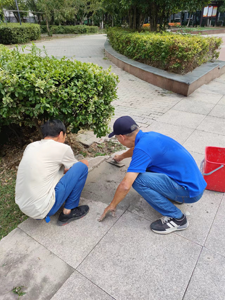 下午2點(diǎn)一上班,保潔隊(duì)長向師傅就將所需的黃沙水泥搬運(yùn)到了花臺(tái)旁邊的空地上,維修曹師傅則開始拎水拌泥漿。為了更快更好地完成修補(bǔ)任務(wù),向師傅變身小工,維修師傅化身泥瓦匠正式開展工作。向師傅先清理掉了原來破損的瓷磚,再用掃帚將泥土打掃干凈,然后由維修師傅將拌好的泥漿一鏟一鏟地覆蓋在花臺(tái)邊緣,最后再一點(diǎn)一點(diǎn)地抹平,兩人互相配合,短短一小時(shí)就將修補(bǔ)工作圓滿完成。