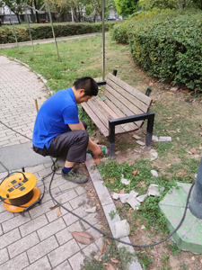 上午新的休閑椅全部安裝完畢,下午兩位維修師傅便開始運(yùn)用切割機(jī)將舊的休閑椅銹蝕的凳腳一一慢慢割開,一個(gè)一個(gè)地進(jìn)行拆除。然后由保潔隊(duì)長(zhǎng)向師傅安排清運(yùn)到倉(cāng)庫(kù),看是否還可以另做它用。