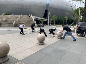 我公司的各安保人員就是一支執(zhí)行力強,有責(zé)任感的隊伍。在一次日常巡查中,保安員發(fā)現(xiàn)在奧體中心8號崗?fù)ぬ,廣場和同慶樓中間的石墩有些錯位。廣場上的石墩布置對該特定區(qū)域起著重要的引導(dǎo)和防護作用,他把行人和車輛間隔起來,既可以保護行人又能引導(dǎo)車輛。石墩錯位,一是對行人和行車安全有隱患,二是歪歪斜斜不整齊也影響美觀。發(fā)現(xiàn)隱患后,我們安保人員第一時間上報主管,主管及時通報甲方并和甲方一起到現(xiàn)場查看。保安主管考慮到石墩是大理石材質(zhì),比較重,稍有不慎會造成傷害事故,又緊急調(diào)來其他幾名安保人員協(xié)助。通過多次嘗試和努力,最終通過用消防水帶固定在石墩下方,一組人員在前方拉拽,另一組人員在后方維持石墩的平衡,大家齊心協(xié)力,終于把石墩恢復(fù)到了原來的位置。