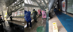 乘著下雨天,我公司保潔人員全體出動,對整個奧體中心的防護鋼網(wǎng)和過道地面進行了系統(tǒng)清潔作業(yè)。大家分工明確,各自在劃定的區(qū)域忙碌起來。先是將洗衣粉和清潔劑撒在濕潤的地面和鋼網(wǎng)表面,然后用專用長柄網(wǎng)刷逐一挨個地來回摩擦洗刷,將強附著的灰塵和污垢都刷洗脫落,再用掃帚和簸箕將固體垃圾清理運走。接著一部分人再用高壓水槍對鋼網(wǎng)和地面進行一次沖洗,直至鋼網(wǎng)和地面流下來的水都是清水后,大家再用掃把將沒有自流排凈的水掃進排水溝,對過道等通道區(qū)域還用拖把拖干凈積水后再鋪上地毯。因為工作量較大,整個清洗作業(yè)持續(xù)了一整天時間,雖然很累,大家都干的很起勁,沒有一個人叫苦叫累!