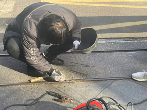 由于近日天氣仍然寒冷,人在外面站一會都感覺受不了,更別說是在外面干活了。只見戴師傅身穿一件薄棉衣,蹲下左看看右看看,在最合適的位置拿錘子一點一點砸著,不一會就把一段壞的地軌拿了出來。又戴上電焊面罩,只見一陣焊光閃現(xiàn),焊條在戴師傅的手里就像聽話的玩具,一會左一會右的,隨時調(diào)整著位置,他時不時還要看看地軌焊得美不美觀。時間也不知過了多久,戴師傅一臉滿意的笑著說:“現(xiàn)在可以了”。