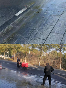 老楊在東門(mén)調(diào)派了一名人手便開(kāi)始了工作,他們一人推車(chē),一人拿著噴槍將地面先進(jìn)行了第一次沖洗,在沖洗完第一遍之后,拿掃把將大量的泥沙和落葉收拾干凈以后,又開(kāi)始了第二遍沖洗,直至地面完全干凈也就結(jié)束了工作。