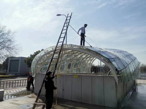 但因此次工作任務(wù)需要高空作業(yè)等特性,成為日常清潔的一個盲區(qū),為此高鐵場站管理部專門組織工作人員進(jìn)行了大清洗。保安們早早地就在現(xiàn)場做準(zhǔn)備工作,將小型灑水車注滿水,保潔們也準(zhǔn)備好了各種清洗工具隨時等待配合。雨棚呈斜角方向,從高處沖刷的水順著斜角留下,由于現(xiàn)場工作人員的年紀(jì)偏大而且雨棚有些許高度,項目經(jīng)理劉源為了確保他們的人身安全,和保潔主管施玉莉親自輪番上陣爬到雨棚頂端一手拿著水管一手拿刷子進(jìn)行刷洗,雨棚終于煥然一新,有效地改善了我們場站的服務(wù)質(zhì)量。