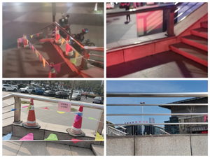 當(dāng)巡查到停車場區(qū)域時(shí),保安員抬眼發(fā)現(xiàn),停車場通往二樓過道處的護(hù)欄不太一樣,只剩下不銹鋼外框架,框架內(nèi)起防護(hù)作用的三根不銹鋼管已不知所蹤,整個(gè)護(hù)欄框架內(nèi)都空無一物,非常危險(xiǎn)。加之此處真好是樓梯過渡的平臺(tái)區(qū)域,時(shí)常會(huì)有經(jīng)過的新人在此處稍作休息,也會(huì)偶爾有小朋友在此游玩嬉戲,一旦有人從此空擋處跌落,后果將不堪設(shè)想,急需立即修復(fù)。