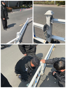 發(fā)現(xiàn)問題后,我司安保員立即將情況上報(bào)主管,并打電話叫來其他同事幫忙,一起將發(fā)生位移的護(hù)欄掰回原處。在移動(dòng)中又發(fā)現(xiàn)其中一處固定護(hù)欄的支架已嚴(yán)重變形,用于固定護(hù)欄和支架的螺絲和底座都已完全脫落。保安員們又立即找來鉗子和螺絲刀等工具,將受損變形的支架敲平,再將脫落的護(hù)欄裝進(jìn)底座用螺絲固定好,使這段因碰撞發(fā)生損壞的護(hù)欄及時(shí)得到了修復(fù),再次恢復(fù)其分流車輛,疏導(dǎo)交通的作用。