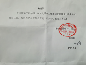 在近期科室回訪中,護(hù)士長(zhǎng)多次對(duì)維修人員的工作提出高度贊揚(yáng),一是贊揚(yáng)維修人員的主動(dòng)性、及時(shí)性;二是贊揚(yáng)維修人員的技術(shù)過硬,責(zé)任心強(qiáng),善于思考,解決了科室諸多實(shí)際問題,這充分展示了高正的工作作風(fēng)和精神風(fēng)貌。