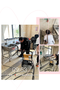 雖然今天是老馬的休息日,但他依然穿上了工作服,拿出了強力水槍,開始了打掃工作,幾個阿姨也相當配合,一個用水槍沖,另外幾個阿姨負責用鋼絲球刷墻面和地面,在他們的配合之下,日常工作中積累下來的油污和衛(wèi)生死角也都被打掃得干干凈凈。正是因為保潔員們平時良好的習慣養(yǎng)成和定期的大掃除,才能讓廚房時刻保持高標準環(huán)境,才能讓業(yè)主們吃得放心、看得舒心。