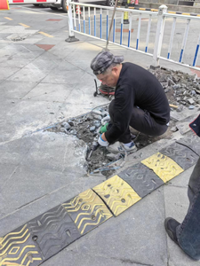 于是在投資廣場項目部的領(lǐng)導(dǎo)下,工程部的師傅們開展了地面修復(fù)工作。全體工程部的師傅們在戴師傅的領(lǐng)導(dǎo)下,在業(yè)主還未上班、早高峰沒有到來前,早早地就開始施工。只見師傅們把一包包水泥和黃沙水混和在一起,一鐵鍬一鐵鍬地攪拌著、翻動著,另一邊又見戴師傅和季師傅拿著電錘和榔頭用力的把道桿邊的磚塊撬開。戴師傅一邊敲一邊看,再旁不斷做著技術(shù)指導(dǎo)。