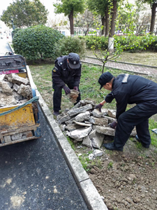 按《2022年常州市城鄉(xiāng)生活垃圾分類工作實施方案》的通知(常政發(fā)(2022)32號)文件要求,小區(qū)的主干道及樓道口等不得再設(shè)置垃圾分類收集桶,太湖明珠苑也在第一時間配合上級實行垃圾分類重新設(shè)桶、完成定時定點投放設(shè)備,并配備好收運車輛,開展收集、收運工作。現(xiàn)舊垃圾桶已全部撤除,所有設(shè)施運轉(zhuǎn)正常,但前期綠化帶已硬化的水泥底座大多破損嚴重,影響小區(qū)整潔的統(tǒng)一面貌。為了進一步提升服務(wù)品質(zhì),周一服務(wù)中心王經(jīng)理在開會時,特安排保安員集中清理太湖明珠苑南、北、西苑所有的原底座水泥塊。