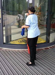 由于水務(wù)大廈面臨馬路主干道,來(lái)往車輛較多,落地窗及玻璃大門每天都會(huì)蒙上薄薄的灰塵,故每天都會(huì)安排保潔員進(jìn)行玻璃擦拭,每周進(jìn)行一次全面的玻璃清潔活動(dòng),才能為客戶提供一個(gè)窗明幾凈的工作生活環(huán)境。