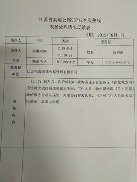 2019年8月1日17:50 分保潔員周書(shū)蘭吃過(guò)晚餐后回到崗位上,當(dāng)打掃至女衛(wèi)生間32號(hào)時(shí),發(fā)現(xiàn)行李架上有一個(gè)女式包,當(dāng)時(shí)第一反應(yīng)就是:包一定是顧客如廁后遺失的,顧客丟失后肯定著急,周書(shū)蘭立即打電話給現(xiàn)場(chǎng)值班管理員,管理員接報(bào)后第一時(shí)間趕到現(xiàn)場(chǎng),領(lǐng)著周書(shū)蘭拿著包前去服務(wù)臺(tái),在服務(wù)臺(tái)工作人員的見(jiàn)證下打開(kāi)包,包內(nèi)有現(xiàn)金1505元,手機(jī)一部,身份證三張,戶(hù)口簿及各類(lèi)證件和多張銀行卡,服務(wù)臺(tái)工作人員通過(guò)廣播尋找失主,通過(guò)10多分鐘不斷播放,但不見(jiàn)失主前來(lái)認(rèn)領(lǐng),失主有可能暫時(shí)未發(fā)現(xiàn)包已丟失,已經(jīng)離開(kāi)服務(wù)區(qū),只好做好登記后存放在服務(wù)臺(tái)。18:53分失主發(fā)現(xiàn)包丟失,用其他手機(jī)打電話咨詢(xún),經(jīng)確認(rèn)協(xié)商后,失主決定前來(lái)認(rèn)領(lǐng),失主于當(dāng)日20:10到達(dá)服務(wù)區(qū),經(jīng)現(xiàn)場(chǎng)確認(rèn)后,把包歸還給失主。失主拿到包后拿出500元以表謝意,被管理員婉言謝絕,跟他解釋這是我們義不容辭的責(zé)任。失主對(duì)工作人員的服務(wù)及員工拾金不昧的精神表示感謝!并致電96777反饋事情經(jīng)過(guò),失主在服務(wù)臺(tái)前用手機(jī)發(fā)了條微博:(用最臟的手,掙最干凈的錢(qián)!請(qǐng)珍重奮戰(zhàn)在烈日下一線員工:由于天氣炎熱,室外氣溫高達(dá)35℃-40℃以上,請(qǐng)大家不要亂扔垃圾,有部分工人因天氣太熱入院,他們很多還是50--60歲以上的老人,而他們卻拾金不昧,不求點(diǎn)贊,只求轉(zhuǎn)發(fā)!還附上了幾張照片),8月2日96777發(fā)來(lái)表?yè)P(yáng)信一份。