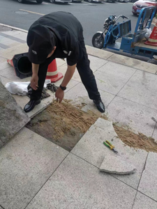 體育館門口一主支撐架一側(cè)的大理石地面出現(xiàn)了多塊地板破損和翹起的情況,當(dāng)班巡邏的安保人員張立財在發(fā)現(xiàn)這一情況上報主管后,立即找來施工工具和維修物料,自己動手維修起來。