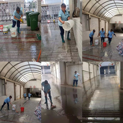 大樓每周三都需要清洗一次坡道,此項(xiàng)工作在高溫天下也依然如期進(jìn)行著,項(xiàng)目部各保潔員各自分工、通力協(xié)作,你負(fù)責(zé)抬水,她負(fù)責(zé)刷地,還有負(fù)責(zé)專(zhuān)門(mén)倒洗衣粉和洗潔精的阿姨...
