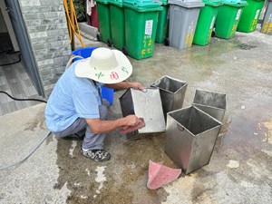 清洗現(xiàn)場,保潔先將垃圾桶托運至垃圾房,用水沖洗并用紅片仔細清洗,隨后將垃圾桶運至規(guī)定放置處。在一趟趟的清運和清洗中,汗水逐漸浸濕了保潔師傅們的后背,但他們毫無怨言仍在堅持作業(yè),直到所有垃圾桶都清洗完成。