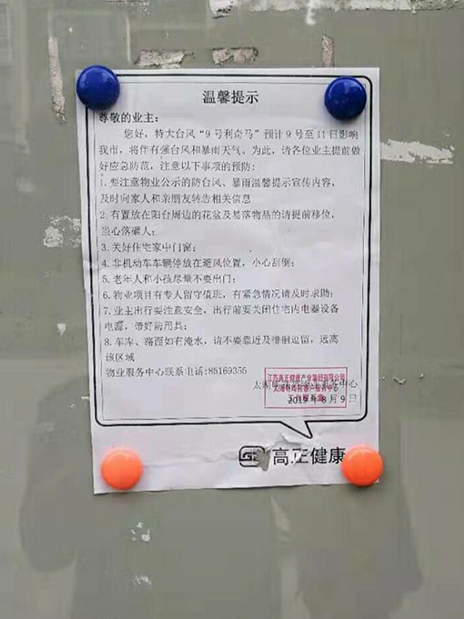 8月份的溫度還是居高不下,據(jù)氣象臺(tái)發(fā)布的消息,特大臺(tái)風(fēng)9號(hào)利奇馬預(yù)計(jì)9號(hào)到11號(hào)影響我市,將伴有強(qiáng)臺(tái)風(fēng)和暴雨天氣。我們太湖明珠苑物業(yè)積極響應(yīng)相關(guān)部門的要求,開始啟動(dòng)防洪應(yīng)急預(yù)案,為了避免小區(qū)可能發(fā)生的安全隱患。