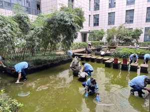 接著保潔、保安齊上陣開始行動。由于池底青苔粘滑,難以清洗,大家劃分區(qū)域,拿著鋼絲球一點點擦拭,然后再拿推水把清理污垢。經(jīng)過大家齊心協(xié)力的勞作,原本渾濁的魚池變得清澈見底,還給了小魚兒一個干凈的家。大家看著自己拯救出的小魚兒在池子里盡情戲耍,都露出了欣慰的笑容。