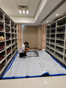 水務大廈檔案室大概有兩百平米,室內墻皮脫落,地毯破舊、屋頂發(fā)霉發(fā)黑,檔案柜積灰深厚,需在一周內全部整改到位。于是項目部整個團隊立即分工合作行動起來。
