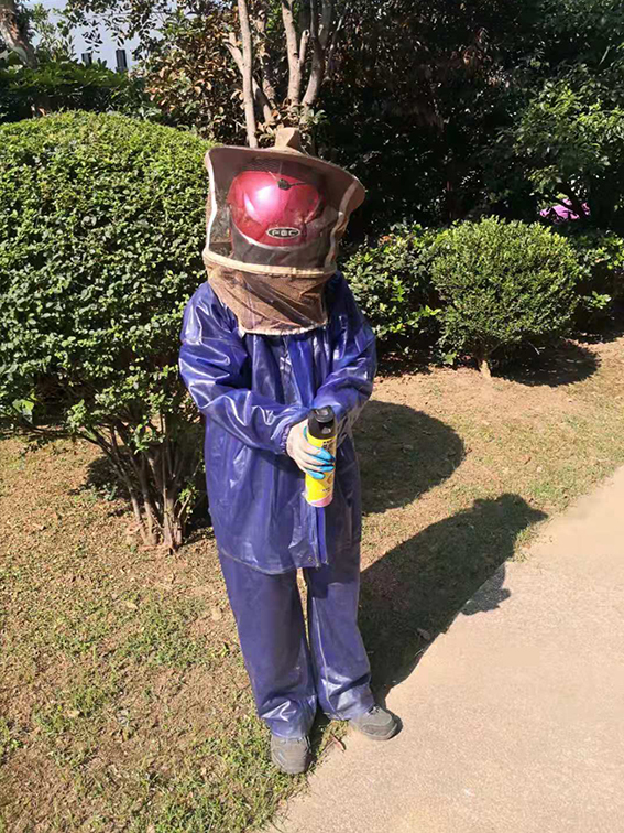 考慮到小區(qū)業(yè)主的安全出行,經(jīng)理與綠化師傅擬定處理方案,買來滅害靈,讓綠化師傅穿好防護(hù)服,戴好防護(hù)裝備,來到現(xiàn)場(chǎng)對(duì)蜂窩進(jìn)行噴射,經(jīng)過半個(gè)多小時(shí)的奮戰(zhàn),終于把蜂窩安全摘下,并放入袋中封存,隨后又再次對(duì)小區(qū)進(jìn)行排查,杜絕漏網(wǎng)之魚。