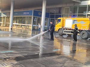 環(huán)衛(wèi)灑水車憑借強(qiáng)大水壓,對(duì)南廣場地面進(jìn)行大面積沖洗。強(qiáng)勁水流如銀色匹練,所到之處,污垢一掃而空。保安、保潔員手持水管、清潔工具,全力協(xié)作,一邊沖洗一邊認(rèn)真清刷著地面。