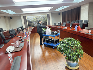 接甲方領(lǐng)導(dǎo)通知,北京特檢院院長一行和江蘇特檢院長交流會將在低溫中心召開。本著給領(lǐng)導(dǎo)留下美好印象的目的,物業(yè)根據(jù)參會流程,全體物業(yè)人員各司其職、各盡職責(zé),齊行動。院區(qū)地面及接待室、會議室阿姨再次精細(xì)打掃擦拭,各樓層綠植修剪。保安負(fù)責(zé)車輛引導(dǎo)停放,車輛停放忙而不亂。根據(jù)參觀路線,阿姨們把各自負(fù)責(zé)的片區(qū)細(xì)節(jié)衛(wèi)生徹底清潔,外圍保潔師傅負(fù)責(zé)把院區(qū)門牌及小公園設(shè)施都全部擦拭一遍,B、C兩個車間的地面,墻壁,玻璃以及門框也徹底大掃除。同時,會務(wù)也按照參會人員名單準(zhǔn)備席卡、話筒、臺板、筆、毛巾和各種會議所需物品,都秉著所有的物品在同一直線上的標(biāo)準(zhǔn)依次擺好。工作部署有條不紊全部到位,院領(lǐng)導(dǎo)對我們的工作甚是滿意。