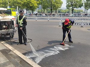 清晨,衛(wèi)生保障小組的安保員便早早集結(jié),攜帶高壓水槍、清潔劑、刷子等專業(yè)工具趕赴現(xiàn)場(chǎng)。面對(duì)地面頑固的污漬,安保員先用刷子蘸取清潔劑反復(fù)刷洗,讓清潔劑充分滲透污漬,再利用高壓水槍進(jìn)行強(qiáng)力沖刷。對(duì)于地面上殘留的污漬,工作人員采用分段作業(yè)的方式,一點(diǎn)一點(diǎn)仔細(xì)清理,不放過(guò)任何一個(gè)死角。盡管工作強(qiáng)度大,過(guò)程辛苦,但大家始終保持著認(rèn)真負(fù)責(zé)的態(tài)度,專注于手頭的任務(wù)。