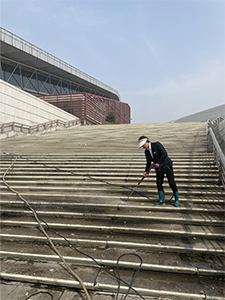 在清洗過(guò)程中,保潔人員們遇到了不少挑戰(zhàn)。由于樓梯上的灰塵較多,他們不得不穿著厚重的雨靴進(jìn)行作業(yè),以防污水濺到身上。高壓水槍的使用也頗具技巧,保潔人員需要對(duì)準(zhǔn)每一個(gè)污漬,一點(diǎn)一點(diǎn)地進(jìn)行沖刷。對(duì)于一些特別頑固的污漬,他們更是毫不留情,用力地對(duì)著污漬沖刷,直到其徹底消失。