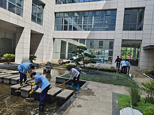 物業(yè)商議決定把景觀池清洗一下,給大家一個干凈整潔的辦公環(huán)境也還小魚兒一個干凈溫馨的家。保安師傅先把浮在水中的樹葉打撈干凈,把小魚兒撈出來先放水桶中,然后把景觀池的水放掉。接著保潔、保安齊上陣,找來了清理工具,刷子、手套、雨靴、鋼絲球以及推水把。由于池底粘滑,難以清洗,大家劃分區(qū)域,拿著鋼絲球一點點刷洗,然后再拿推水把清理污垢。通過大家齊心協(xié)力的勞作,原本渾濁的魚池變得清澈見底,大家看著自己的勞動成果,臉上都露出了欣慰的笑容。