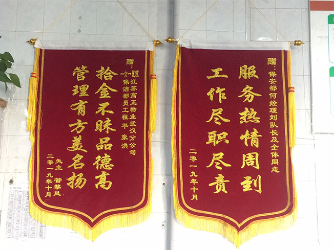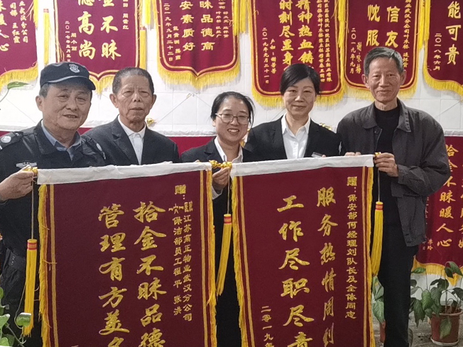 拾金不昧,是中華民族的傳統(tǒng)美德,也是一個(gè)人高尚品質(zhì)的具體體現(xiàn)。武漢161項(xiàng)目好人好事層出不窮,有樂(lè)意幫助病人、有危難時(shí)刻挺身而出的、有拾金不昧的……近日,161項(xiàng)目家屬區(qū)有一女士不慎將一個(gè)裝有重要證件的挎包遺失,在她萬(wàn)分焦急之際,我們項(xiàng)目的程主管、張主管上前詢(xún)問(wèn)怎么回事,田女士講出了事情的經(jīng)過(guò),兩位主管來(lái)到警務(wù)室找到保安班長(zhǎng)劉建林,經(jīng)過(guò)監(jiān)控調(diào)查,發(fā)現(xiàn)被院內(nèi)一位老人拾到,他們經(jīng)過(guò)三天的追蹤,終于找到那位老人,經(jīng)過(guò)多次做通老人的工作,讓他交出了挎包,于是他們將裝有警官證、身份證、銀行卡還有900元現(xiàn)金等物品的挎包都交給了失主,失主非常感謝我們高正集團(tuán)武漢分公司的領(lǐng)導(dǎo)和員工,稱(chēng)贊我們領(lǐng)導(dǎo)管理有方,員工素質(zhì)高。特送來(lái)兩面錦旗,夸我們“拾金不昧品德高 管理有方美名揚(yáng)”。